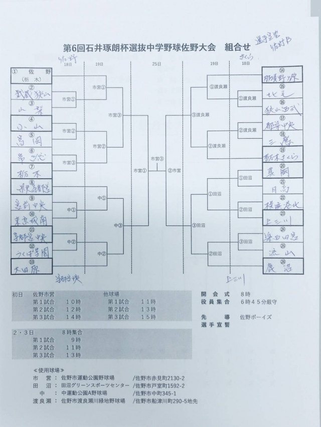 5/18(土)から石井琢郎杯が開催されます。佐野市営球場にて開会式が行われます。栃木ボーイズは5/18(土)の第3試合にて、常総ボーイズ様と対戦します。皆さんの応援、宜しくお願いします。