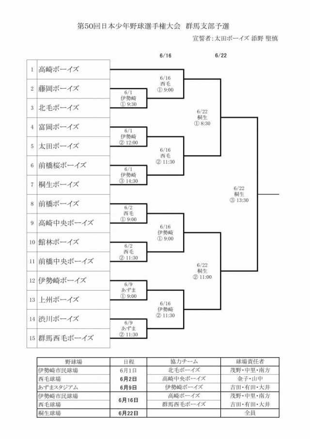 > 第50回日本少年野球選手権大会 群馬支部予選 組合せ決まる。
