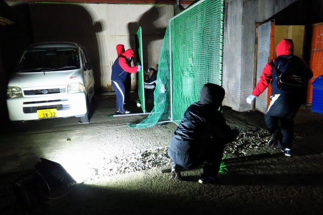 ところで、10期生のお父さん達は、バッティングネットを主体的に手作りしました。金子さんがフレームを制作し、平日の夜練習の合間に、皆でフレームにネットを張りつけました(写真1枚目)。休日の室内練習で、一気に完成させ(写真2枚目)、5月より使い始めることが出来ました。