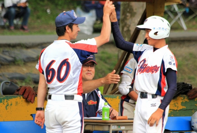 4回に伊藤投手から小田部投手に交代し、6回まで無得点の好投。5回裏、臼井選手のヒットから得点。6回裏、伊東選手が代打で、初球を打ち見事に左中間に安打。すかさず、臼井選手がタイムリーを放ち追加点を重ねました(写真1枚目)。伊東選手がベンチに戻ると、小川監督と笑顔のハイタッチ。いい写真が撮れました(2枚目)。