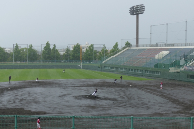4回裏にピンチの場面で豪雨に見舞われます
