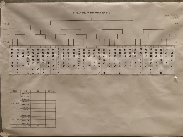 令和元年7月20日(土)「第23回 上毛新聞社 中学硬式野球大会」の組合せ抽選会が、前橋市の上毛新聞社ホールにて行われました。東北から神奈川までの各地から、32チームが出場し開催されます。3年生にとっては、最後の大会となります。悔いの残らないよう、全力でプレーしてもらいたいと思います。