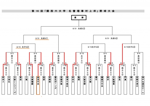 > 第16回「関西六大学 名誉理事村上杯」野球大会 日程変更トーナメント表(7/28までの結果)