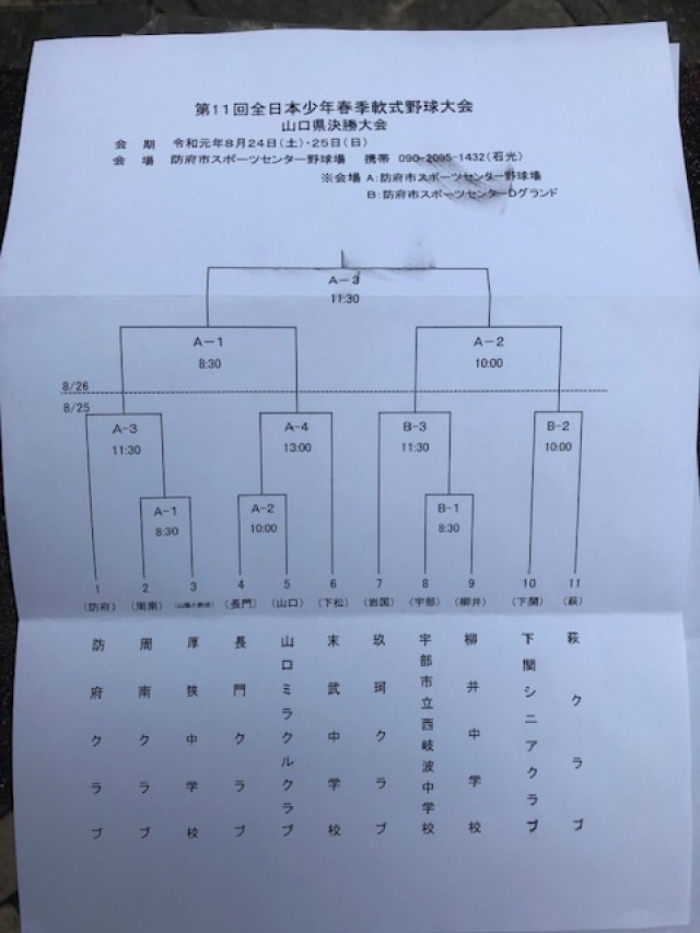 第11回全日本少年春季軟式野球大会山口県決勝大会が令和元年8月24日から25日の日程で防府市スポーツセンター野球場にて開催されます。