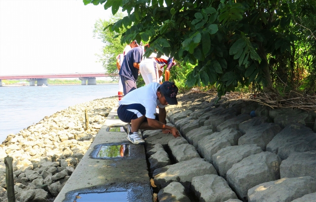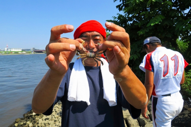 この日は台風10号が通り過ぎた後のフェーン現象で、気温が40℃近く中での試合でした。敗戦もあり、さぞかし疲れているだろうと、少しでも涼しい場所の川べりで昼食になりました。昼食のあとに、箒川で魚を素潜りで捕っていた父親が、毛ガニを見つけたと伝えると、興味を持って多くの選手が毛ガニを探しに護岸の石の隙間を探し出しました(写真2)。すると4匹の毛ガニを捕まえました。持ち帰って水槽で飼って大きくしてから、食べるそうです。ちょっとワイルドですね。思いがけず、東京で毛ガニに出会え自然に触れ合えたひとときでした。