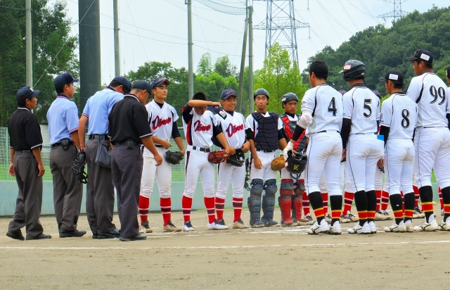 9月21日は、上毛新聞社杯の2回戦。相手は、高崎ボーイズ様。練習試合を数度やらせてもらいましたが、いつもボコボコにされてしまう相手です。というのも、体が大きい選手が良く鍛えられていて、打力が物凄いからです。試合開始の整列でも、体の大きさは歴然。江部選手は笑い、奥村選手は珍しいものをみている眼差しです(写真1枚目)。