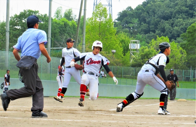 4回からは星投手が登板し、体が最も大きい小林恵人選手に2ランを喫するも、5回は無得点に抑えます。続く6回に永山投手が登板し、その小林選手から見事三振を奪って、ゼロに抑えます。すると、6回裏にチャンスが訪れます。ラッキー気味の伊藤選手のレフト線への2塁打を、浜中選手が送りバンドを決め進塁。君島選手が、センターへ犠牲フライを打ち、3-2の勝ち越し。見事な仕事を果した君島主将がベンチに戻ってくる表情がとても嬉しそうで、印象的でした(写真3枚目)。