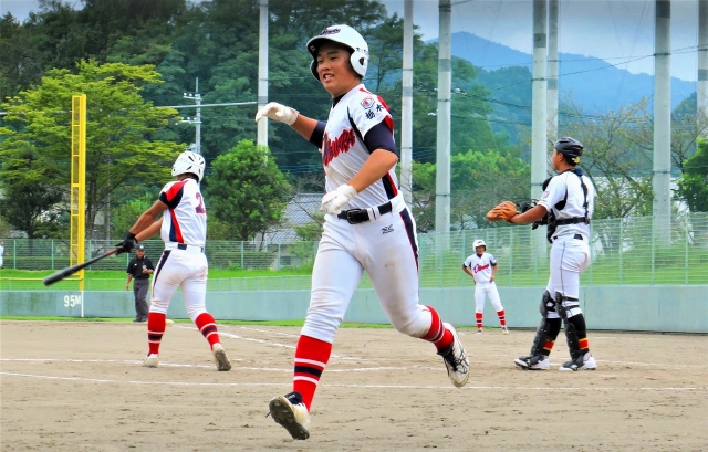 試合序盤は、先発の小田部投手の好投もありゼロで抑えると、1回裏に伊藤選手の右中間を抜ける3塁打を、浜中選手がスクイズを決め、1点先制。続く2回裏、小田部選手が四球を選びパスボールで2塁に進塁すると、江部選手のセンターへのクリーンヒットで2点目(写真2枚目)。試合の主導権を握ります。