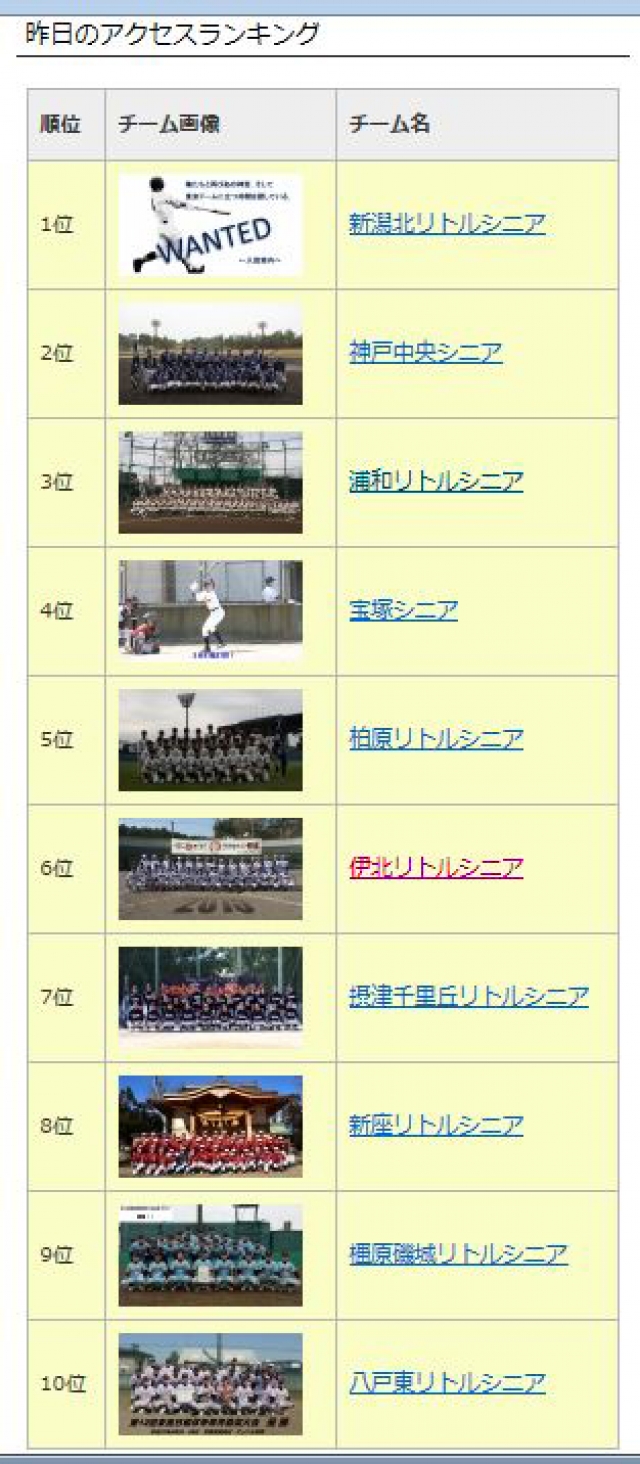 なんと! 昨日4月27日、伊北シニア熱投HP開設以来の単日アクセス記録を更新しました。今までの記録は2014年11月9日の [1,777] でしたが、その記録を大きく上回る [1,981] のアクセスがありました。多くの皆様にご覧頂き、本当にありがとうございます。さらに! 全国の少年野球から高校野球チームに特化したこの熱投HP登録6,412(リトルシニア:564)チーム中、第6位とトップ10にも入りました!!! うれしい~っ!!! これから公式戦が続きます。試合結果も『うれしい~っ!!!』報告がバンバン出来るよう頑張りますので、皆さんで盛り上げてまいりましょう↗