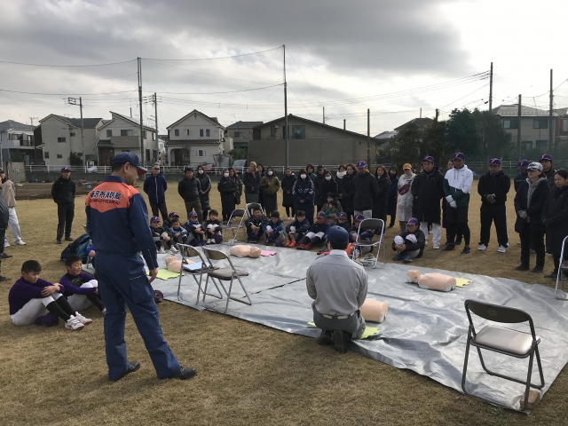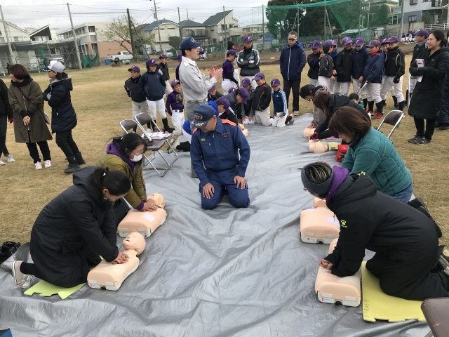 藤沢消防署のご協力のもと、リトルカテゴリー選手と父兄に向けてAED講習会を行いました。緊急時にどのような手当をするべきか、AEDの使い方含めて理解を深めることができました。