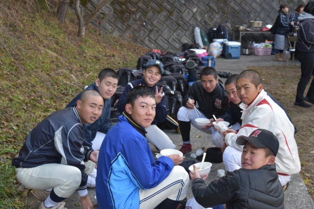 道免八幡神社にて初詣・安全祈願をおこなった後、多数のOBの選手と一緒に汗を流し、炊き出しを食べて過ごしました。