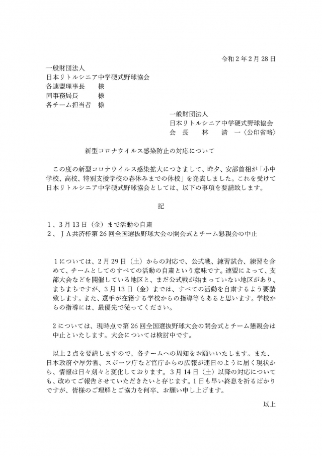 本日「日本リトルシニア中学硬式野球協会」より「新型コロナウイルス感染防止の対応について」の要請がありました。