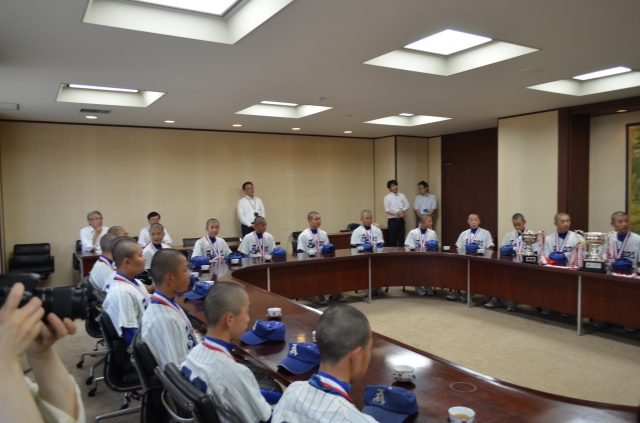 冒頭、松本スポーツ振興課長様より訪問のご説明をいただいた後、緊張してした選手達に守備位置や打順、遠方からの選手に対して練習場所までの参加方法など、一人一人ご丁寧に聞いて頂き終始和やかな雰囲気の中での訪問となりました。