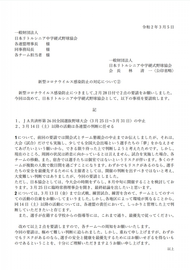 日本リトルシニア中学硬式野球協会より添付通達が出ています。