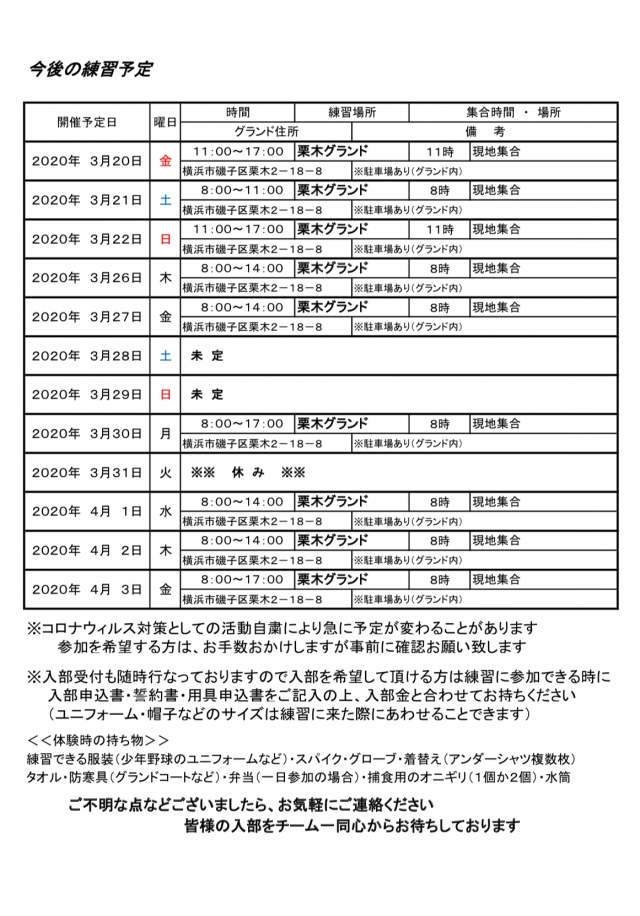 3月度練習再開、体験会案内