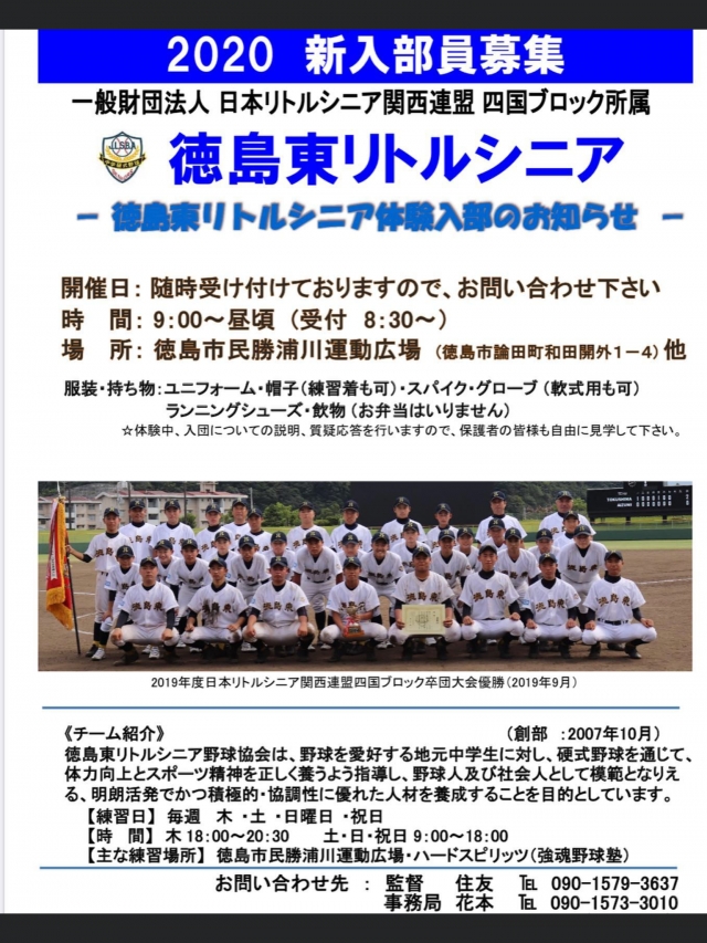 徳島東リトルシニアでは、新入部員を募集しております。