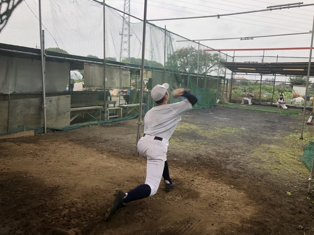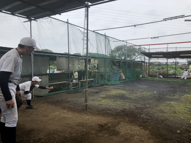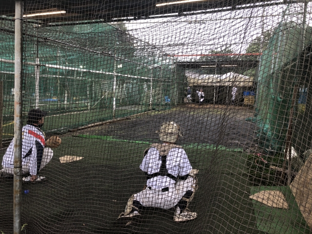 設備を活かして、小雨のなかでもバッテリー陣はブルペンに入って投球練習を行います!
