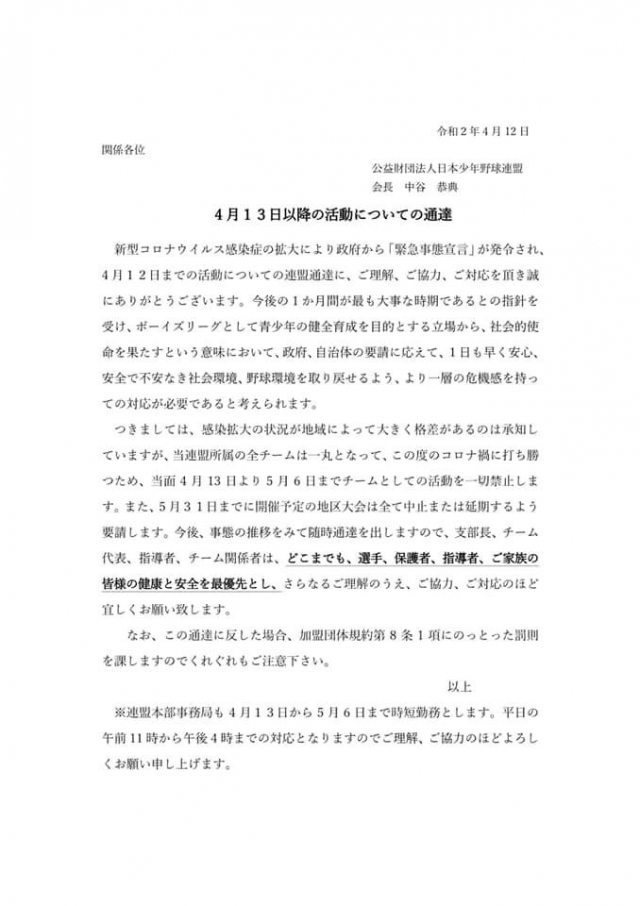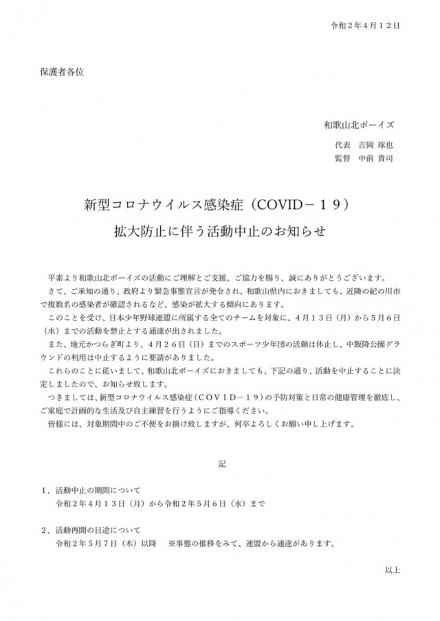 新型コロナウイルス感染症予防の為の練習自粛について