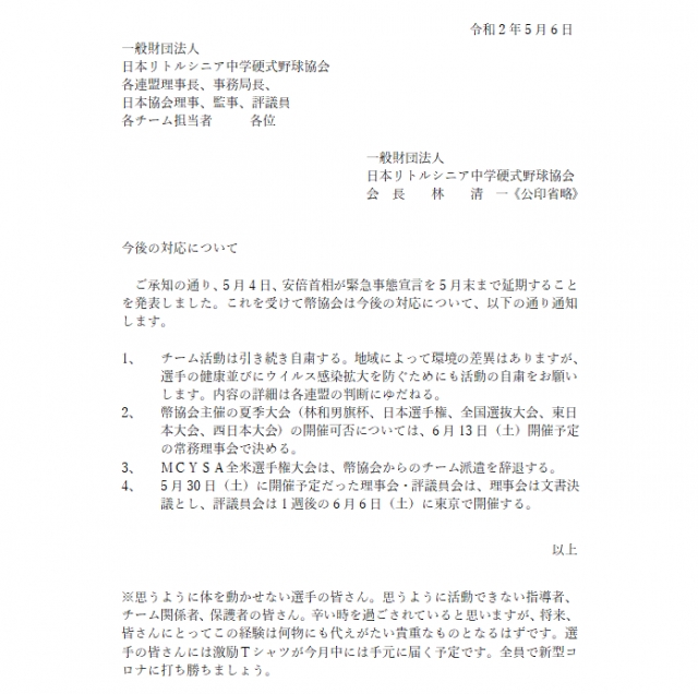 日本リトルシニア中学硬式野球協会より、今後の対応について通知がありましたのでお知らせ致します。