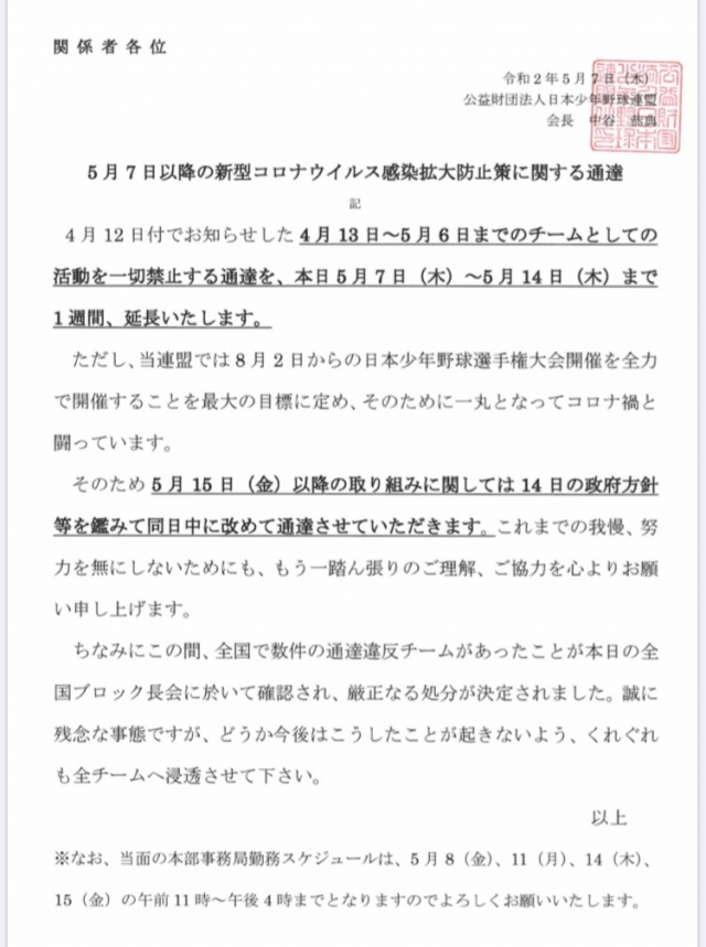 日本少年野球連盟より、活動禁止延長の通達がありました。5/14(木)までの活動禁止延長になります。ご一読ください。