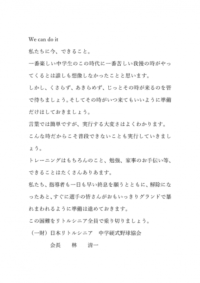 日本リトルシニア中学硬式野球協会会長より選手へメッセージが発表されましたのでお知らせ致します。