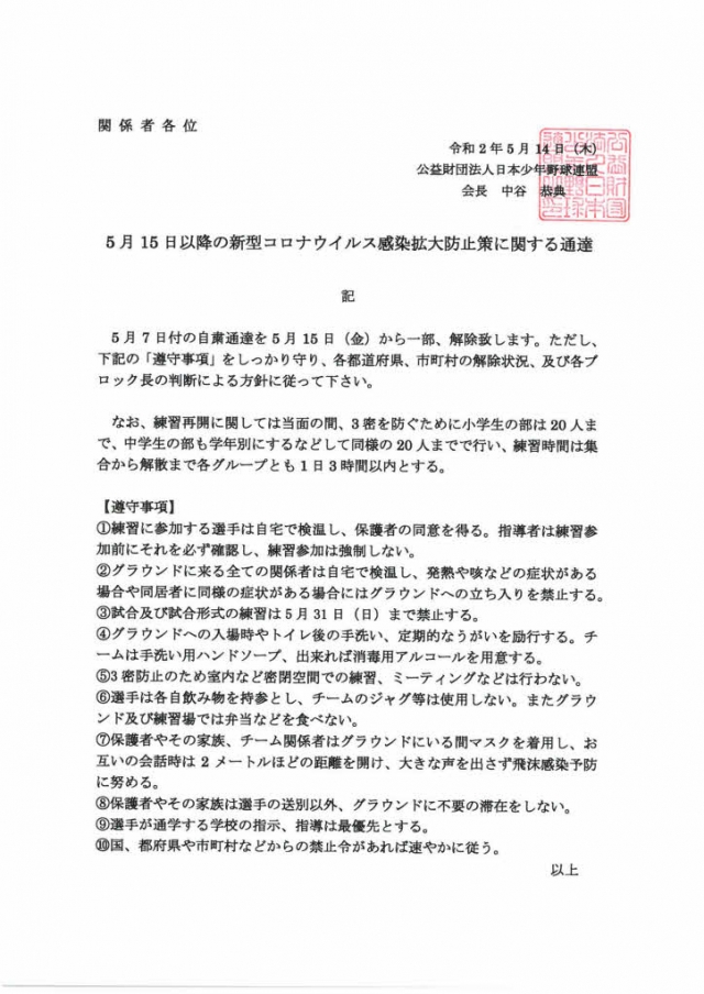 連盟より、5月15日以降の新型コロナウイルス感染拡大防止策に関する通達がありました。