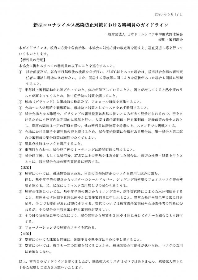 日本リトルシニア硬式野球協会より「新型コロナウイルス感染防止対策における審判員のガイドライン 」の発表がありましたので掲載致します。