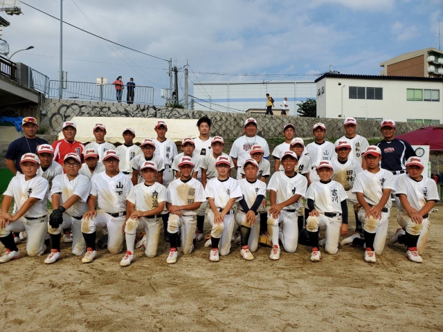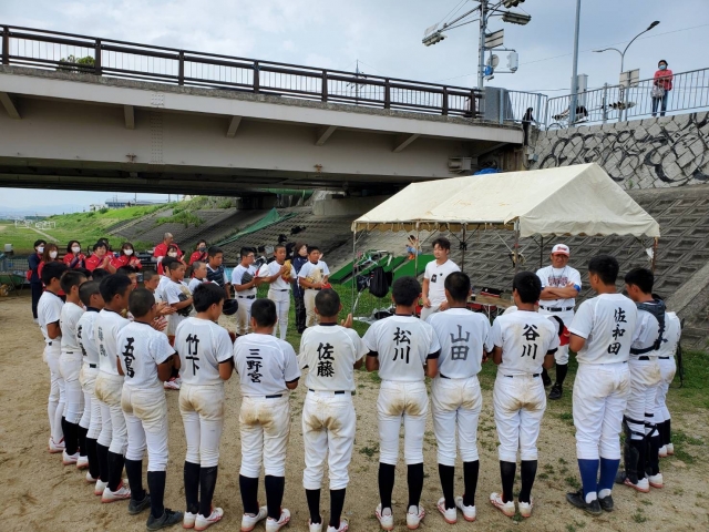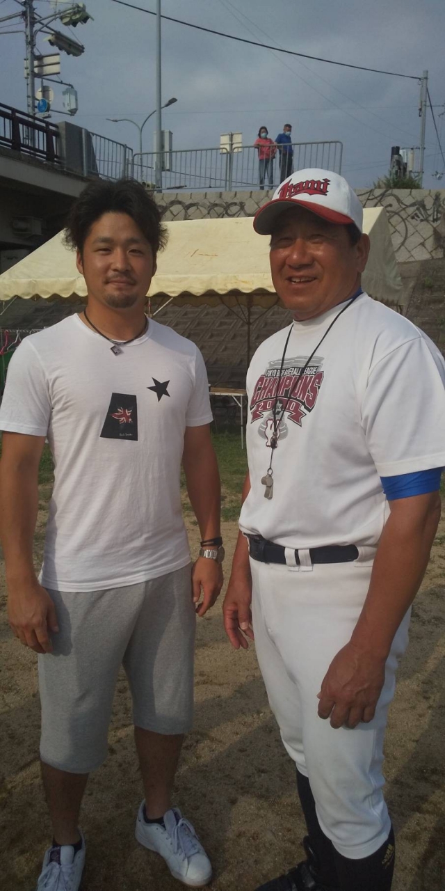 伊丹リトルシニアOB、大阪桐蔭高校で甲子園優勝、立教大学を経てJFE東日本三番打者として昨年社会人都市対抗野球大会優勝、若獅子旗(新人賞)受賞、社会人ベスト9(セカンド)の峯本匠選手が河川に来てくれました。選手皆にお声掛けしてもらい、パワー頂きました。
