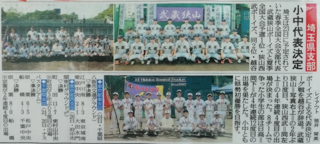 7月29日(水)の「スポーツ報知」に全国大会に出場の決まった埼玉県支部、小中代表の記事が掲載されました。