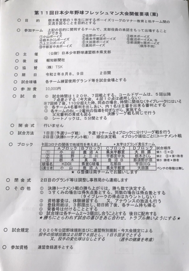 8/8、9に行われる第11回日本少年フレッシュマン大会の組み合わせが決まりました。