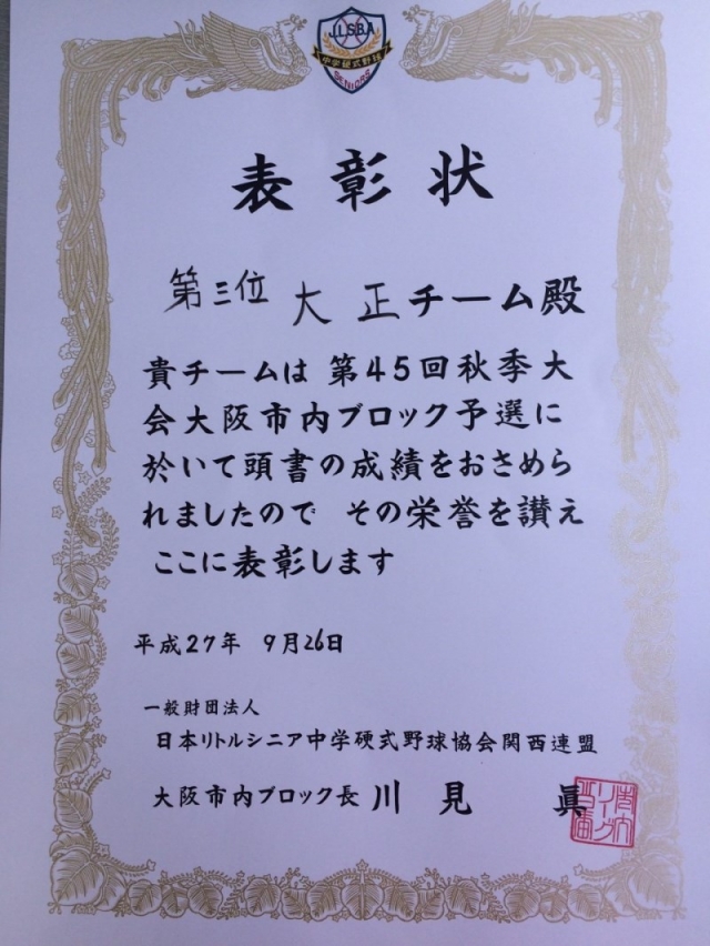 大阪市内ブロック予戦にてなんとか市内第3位と結果で10月10日から開催されます。関西大会本戦に出場権利獲得しました。この大会はタイガースカップ 選抜大会の切符がかかっています。全力野球でみなさん頑張りましょう!!