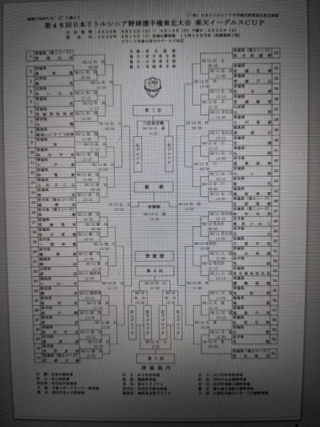 第46回日本リトルシニア野球選手権東北大会 楽天イーグルスCUP トーナメント表