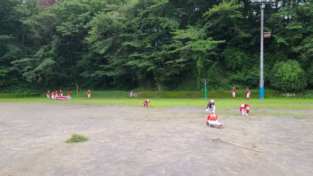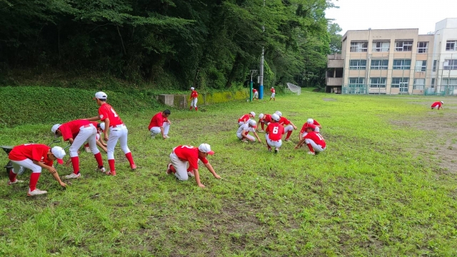 当チームの基本方針は「自主自立」。いつもグランド作りや整備は選手が行っていますが、夏場は雑草がチョー元気!グランド周りの茂みもジャングルと化し、ファールボール探しも困難に…野球ができる環境を知る良い勉強ですね。