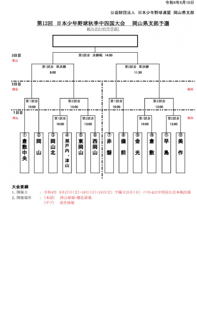 第12回日本少年野球秋季中四国大会岡山県支部予選組み合わせアップしました。