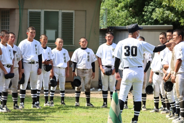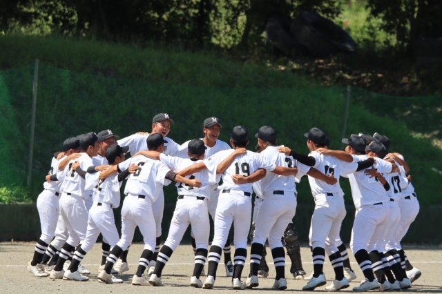 トップチームとなってはじめての公式戦。円陣にて気合を入れると、気迫溢れる面持ちで試合に臨みました。初回先頭バッターが出塁すると、相手投手の立ち上がりを攻めて幸先良く3点を先制。先発投手の好投で1、2回を0点に抑えると3回、1死1.3塁のチャンスにライトオーバーを放ちこの回3点を追加。3回裏に守備の乱れから3点を失うも、投手の気迫溢れる投球が良い流れを引き戻し、5回に先頭バッターの出塁に続き、ライトへのタイムリー2ベースなどで2点を追加。6回に2死2.3塁のピンチを迎えたが好守備で0点に抑え、7回には打線が繋がり4点を追加。