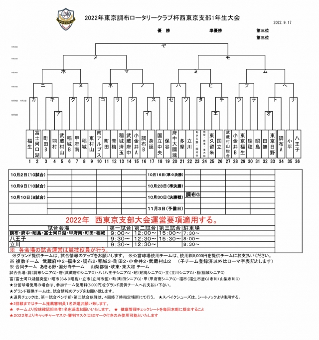 2022年東京調布ロータリークラブ杯西東京支部1年生大会の組み合わせ抽選会が行われ、1回戦の対戦対戦相手が決まりました。