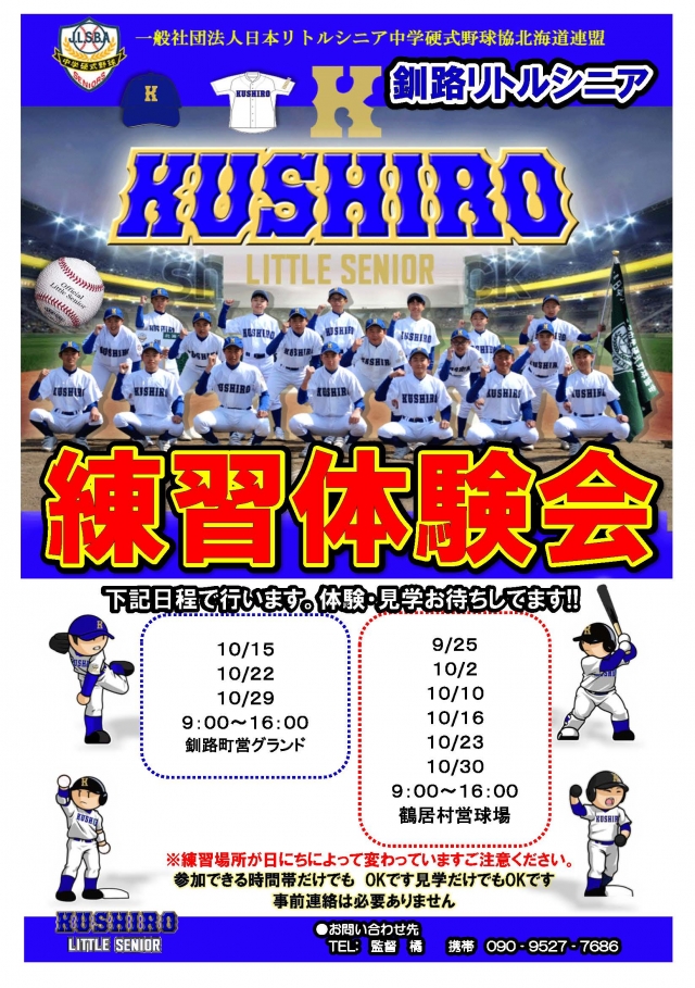 釧路リトルシニアでは硬式野球を知ってもらう為、また、どの様な練習しているのか?など一人でも多くの方に知って頂くため「練習体験会」を開催しています。