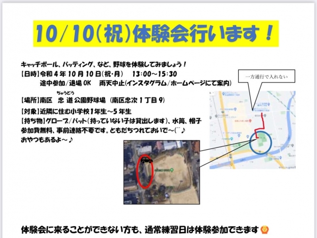 10月10日の体験会は雨天決行します。天候によっては場所を変更する場合もございますので、参加予定の方は一旦忠道公園に集合して下さい。また変更の際には改めてホームページ、インスタグラムにてご案内しますので、ご確認ください。