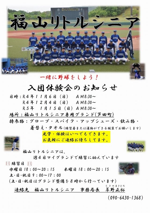 福山リトルシニア入団体験会を開催いたします。