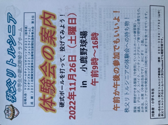 2022年秩父リトルシニア体験練習会を開催します!