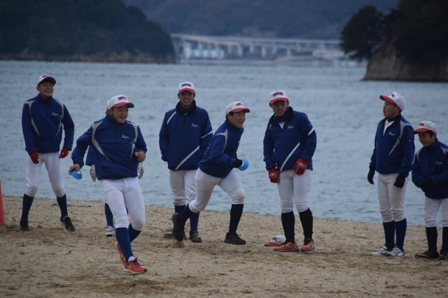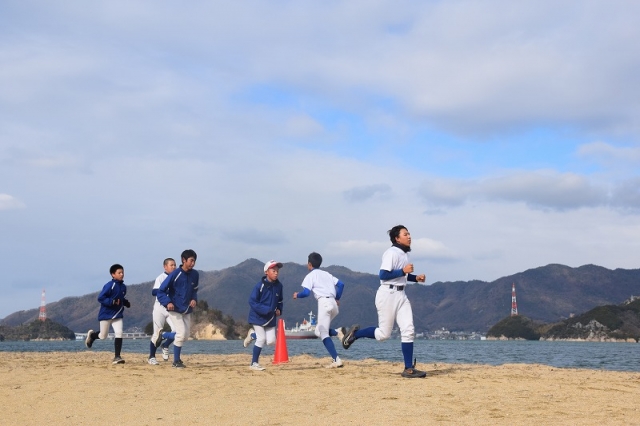 青い海の前でランニング、ダッシュ・・・いつもは厳しいメニューも青い海の前では何故か笑顔で取り組めます。