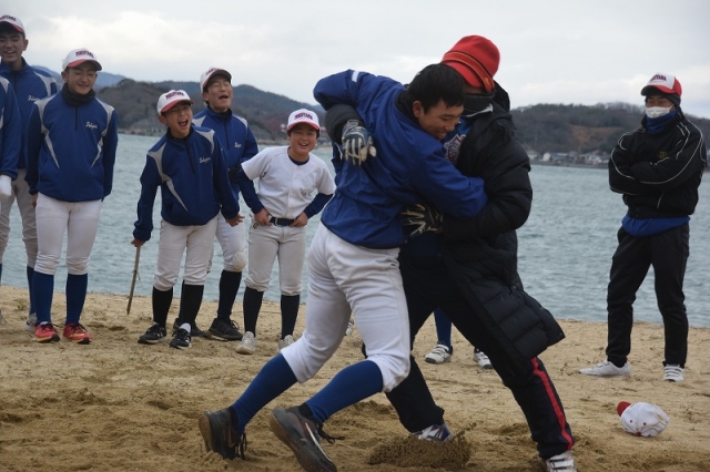 砂浜トレーニングの最後の締めは、こちらも恒例の相撲大会です。オオトリは監督との相撲です。