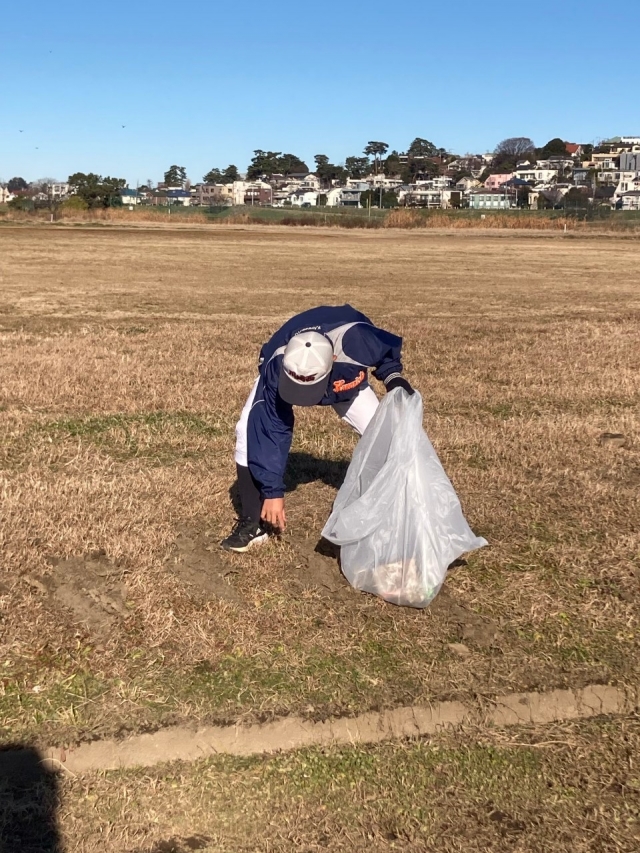 これからまた1年お世話になるグラウンドの周りのゴミをみんなで拾い、その後現役選手とOB選手、一緒に体を動かしました。