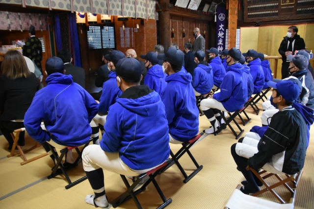 七尾市山王町にある大地主神社で必勝祈願を行いました。長岩監督や大岡主将らが代表して玉串をささげ、全員でかしわ手を打って一年の活躍を誓いました。
