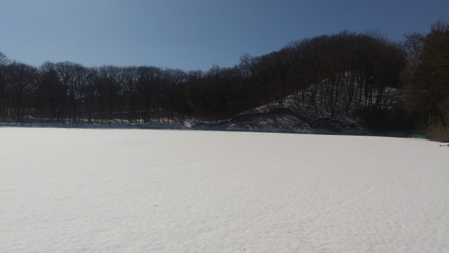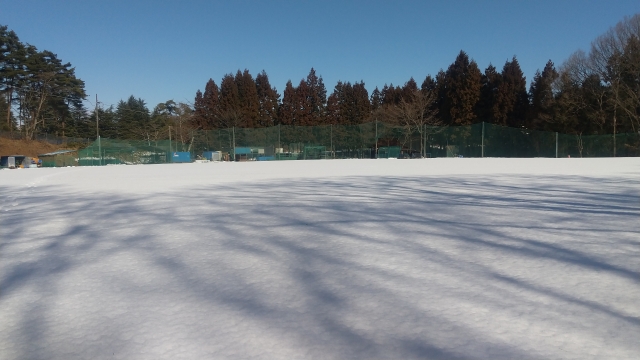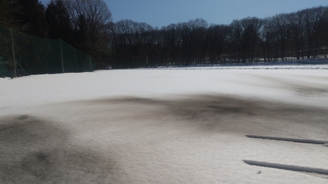 雪解けの進行を期待し、1塁側の一部には、気温上昇・晴天を利用し、雪かき下記を行うのではなく、砂を巻いてみました。