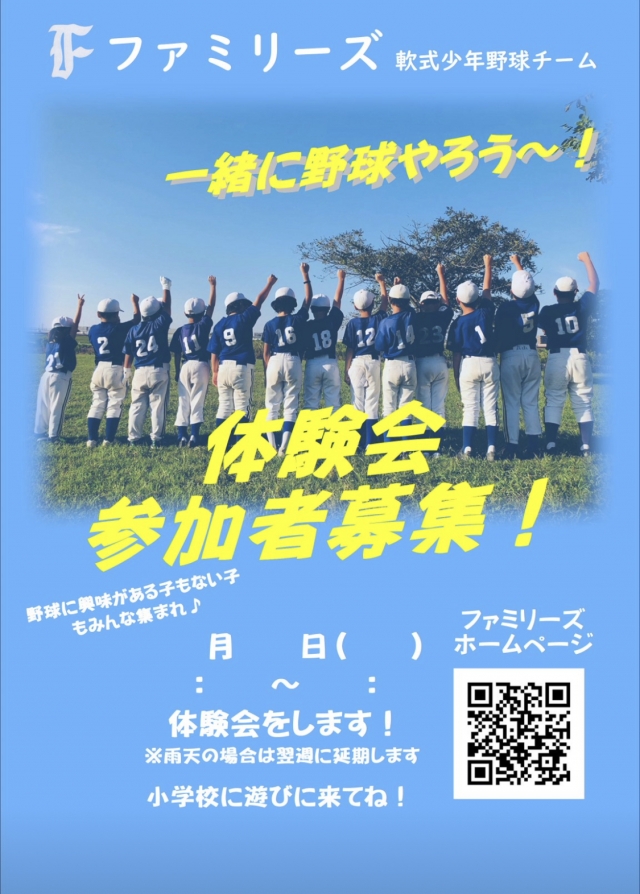 以下の日程で少年野球チームファミリーズの体験会(対象:新1年生〜新5年生)を開催致します。ご参加しないで見学のみでも大歓迎ですので、フラッと立ち寄ってみて下さい❗️