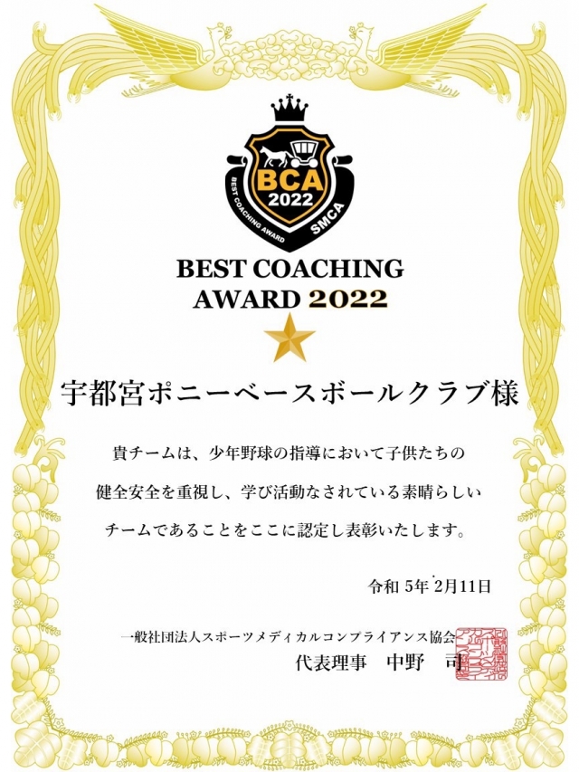 宇都宮ポニーは、3年連続で『ベストコーチングアワード2022』シングルスターを獲得しました!