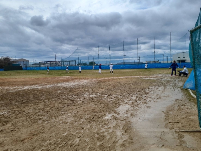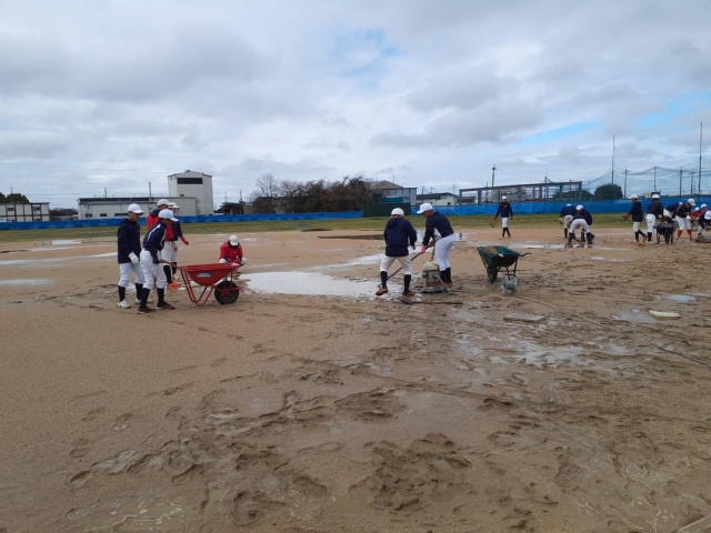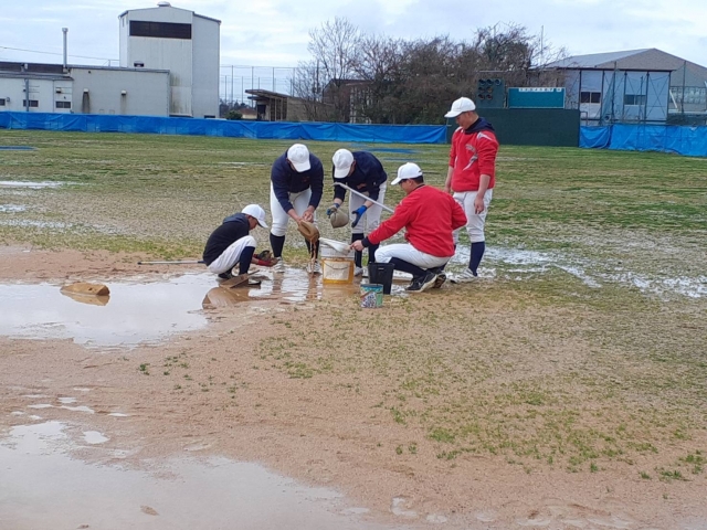 本日は通常練習でしたが雨天だった為雨がやむのを待ち、選手全員で水抜き作業を行いました。