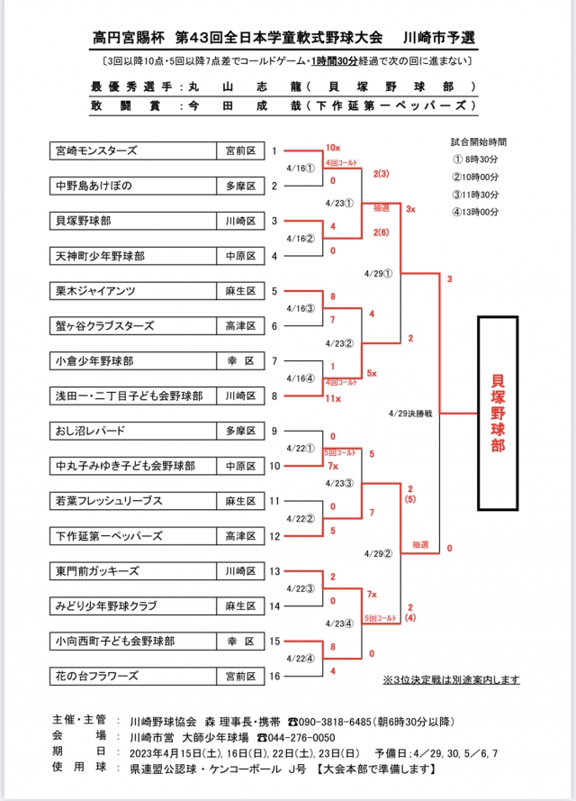 熱戦が続いた川崎市予選の表彰式が決勝戦後に行われました。