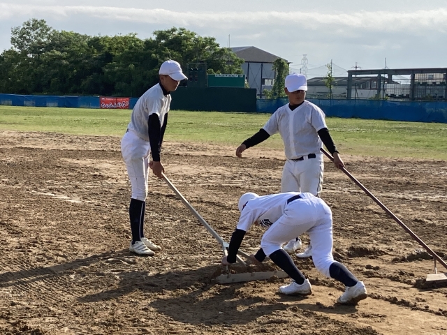 今日の午前中の前半は前日の雨が残っていたのでグランド整備をし、後半から午後にかけてバント練習、内野ゴロ練習、外野フライ練習を各グループに分けて練習しました。